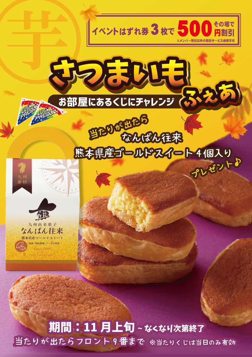 2025年11月さつまいもふぇあ♪ HOME ニュース 2025年11月さつまいもふぇあ♪ 2025年11月さつまいもふぇあ♪ 11月はさつまいもふぇあ♪♪ 当たりが出たらなんばん往来『熊本県産ゴールドスイート4個入り』をプレゼント!! お部屋にあるくじ引きにチャレンジしよう! 新着情報&お知らせ お知らせ一覧 2025年11月さつまいもふぇあ♪ 期間限定チケット配布中!! ミニキッチン付き208号室限定!!スペシャルパッケージプラン 2025年10月ハッピーハロウィン♪※このイベントは終了しました 2025年9月フェイスパック抽選会♪※このイベントは終了しました 2025年8月スイカフェア♪※このイベントは終了しました 208,210,308号室ワンランク上の眠りを提供 308号室露天風呂リニューアル♪ 2025年7月ひんやりフェア♪※このイベントは終了しました 最新マッサージ器導入♪