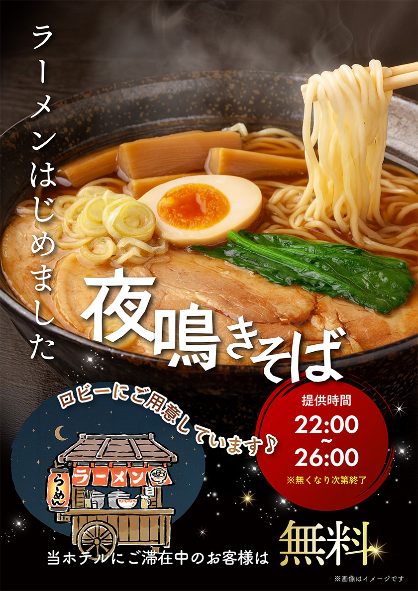 夜のお時間にラーメンを無料サービス! HOME ニュース 夜のお時間にラーメンを無料サービス! ラーメンはじめました。夜のお時間に夜鳴きそばを無料サービス! ホテルイエロー所沢にご滞在しているお客様に、夜のお時間限定でラーメンを無料サービス致します。ホテルロビーでご提供しております。 ■夜鳴きそば提供時間 22:00~26:00 ※無くなり次第終了 新着情報&お知らせ お知らせ一覧 2025年12月年末年始イベント♪ 夜のお時間にラーメンを無料サービス! 2025年11月さつまいもふぇあ♪※このイベントは終了しました 期間限定チケット配布中!! ミニキッチン付き208号室限定!!スペシャルパッケージプラン 2025年10月ハッピーハロウィン♪※このイベントは終了しました 2025年9月フェイスパック抽選会♪※このイベントは終了しました 2025年8月スイカフェア♪※このイベントは終了しました 208,210,308号室ワンランク上の眠りを提供 308号室露天風呂リニューアル♪