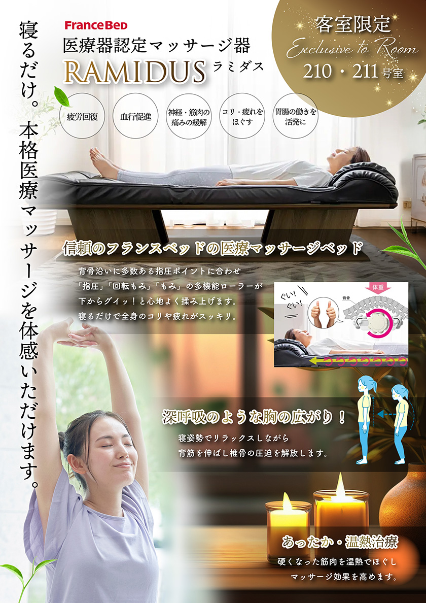 本格医療マッサージベッド♪ラミダス/RAMIDUSを体感頂けます!! HOME ニュース 本格医療マッサージベッド♪ラミダス/RAMIDUSを体感頂けます!! 客室限定!寝るだけで本格医療マッサージ ラミダス/RAMIDUSを体感頂けます!! 210、211号室限定!!信頼のフランスベッドの医療器認定マッサージベッドを導入しました。寝るだけで全身スッキリ♪深呼吸のような胸の広がりを感じて下さい! 新着情報&お知らせ お知らせ一覧 医療機器認証のプレミアムマッサージチェアを体感頂けます!! 本格医療マッサージベッド♪ラミダス/RAMIDUSを体感頂けます!! 2026年1月25日 所沢シティマラソン大会による交通規制のお知らせ 2026年1月ほっと快眠キャンペーン♪ 2025年12月年末年始イベント♪ 夜のお時間にラーメンを無料サービス! 2025年11月さつまいもふぇあ♪※このイベントは終了しました 期間限定チケット配布中!! ミニキッチン付き208号室限定!!スペシャルパッケージプラン 2025年10月ハッピーハロウィン♪※このイベントは終了しました