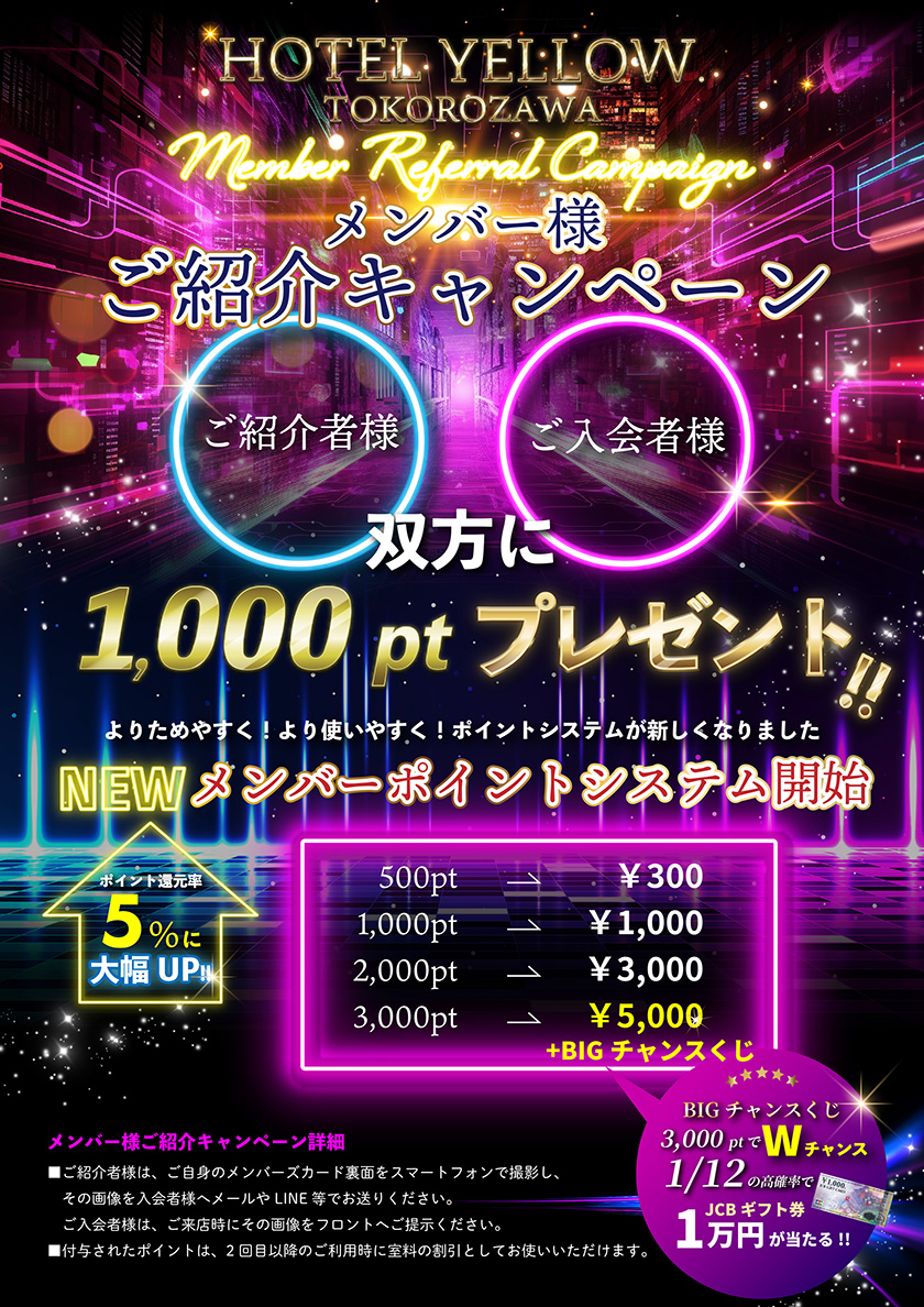 イエロー所沢メンバー様ご紹介キャンペーン!! HOME ニュース イエロー所沢メンバー様ご紹介キャンペーン!! イエロー所沢メンバー様ご紹介キャンペーン!! よりためやすく!より使いやすく!メンバーポイントシステムが新しくなりました! 今なら新規メンバー様をご紹介頂いたお客様&ご入会者様双方に、メンバーポイント1000ptをプレゼント致します♪ 新着情報&お知らせ お知らせ一覧 イエロー所沢メンバー様ご紹介キャンペーン!! 2026年2月バレンタインイベント♪ 医療機器認証のプレミアムマッサージチェアを体感頂けます!! 本格医療マッサージベッド♪ラミダス/RAMIDUSを体感頂けます!! 2026年1月25日 所沢シティマラソン大会による交通規制のお知らせ 2026年1月ほっと快眠キャンペーン♪※このイベントは終了しました 2025年12月年末年始イベント♪※このイベントは終了しました 夜のお時間にラーメンを無料サービス! 2025年11月さつまいもふぇあ♪※このイベントは終了しました 期間限定チケット配布中!!